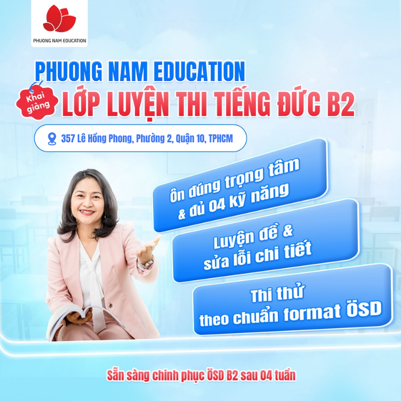 Phuong Nam Education hy vọng bài viết trên đây sẽ giúp bạn nắm được những thông tin hữu ích khi ôn thi B2 tiếng Đức. Ở trình độ tiếng Đức B2 - trình độ trung cấp tiếng Đức thì việc tự ôn luyện tại nhà có thể khiến các bạn học viên cảm thấy khó khăn, dễ nản chí do khối lượng kiến thức nhiều và sâu. Vì thế, bạn cũng có thể tham khảo các khóa học tiếng Đức tại các trung tâm uy tín để được tư vấn lộ trình học phù hợp, rút ngắn thời gian học và đạt hiệu quả nhanh chóng.